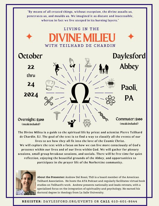 “Living in the Divine Milieu with Teilhard de Chardin” Tuesday, October 22 – Thursday, October 24, 2024Register Here: https://daylesford.org/event/living-in-the-divine-milieu-with-teilhard-de-chardin/Overnight: $300 (includes meals)Commuter: $100 (includes meals) “By means of all created things, without exception, the divine assails us, penetrates us, and… Continue reading